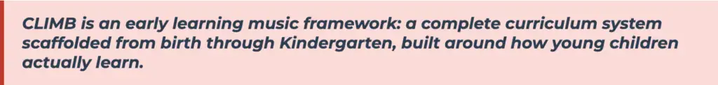 We use the word framework because CLIMB isn’t a collection of songs or a box of activities. It has a deliberate structure underneath it: